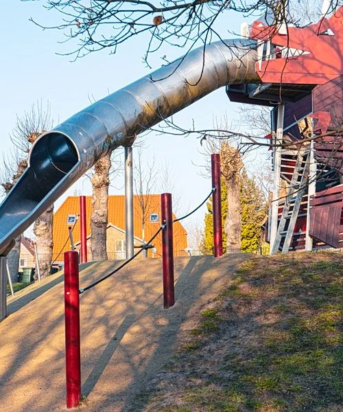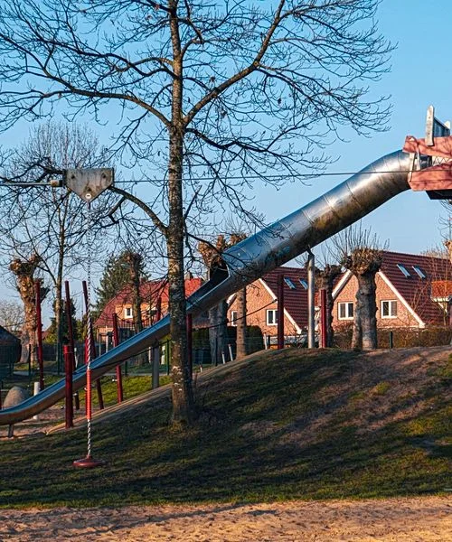 Die große Drachenrutsche ist ein echtes Highlight und sorgt für viel Spaß beim Spielen. Zusätzlich lädt eine Drachenfigur zum Klettern und Entdecken ein. Zusammen mit den freien Flächen entsteht ein abwechslungsreicher Ort für aktive Zeit im Freien.