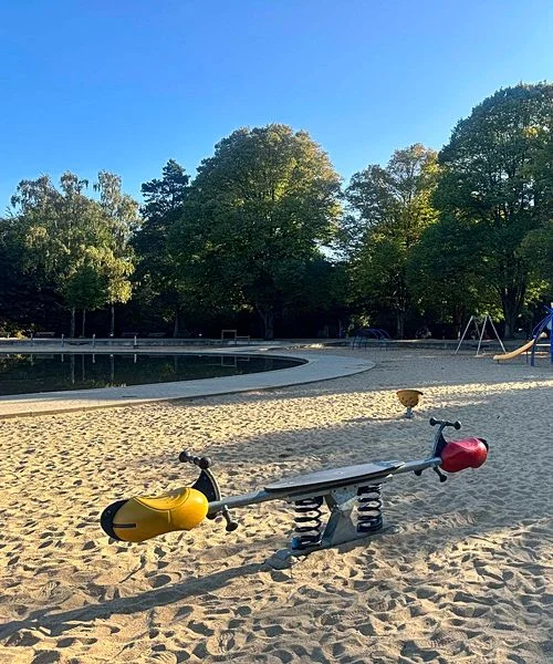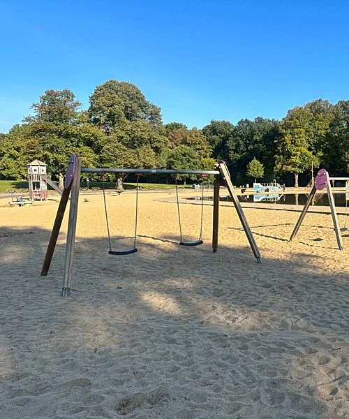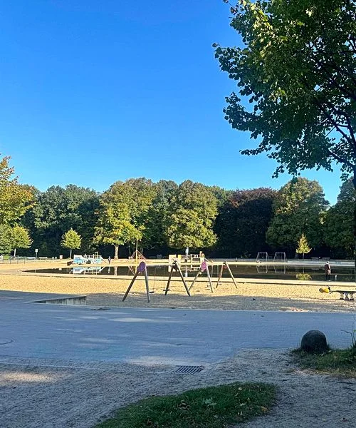 Der Spielplatz auf der großen Festwiese im Stadtpark ist ein Paradies für kleine Entdecker. Das weitläufige, flache Planschbecken bietet an warmen Tagen die perfekte Abkühlung zum Pritscheln und Toben. Direkt daneben warten riesige Schaukeln, Klettergerüste aus Holz und weitläufige Sandflächen darauf, bespielt zu werden. Während die Kids auf dem Parcours ihre Geschicklichkeit testen, bietet die angrenzende Liegewiese viel Platz für ein Familienpicknick.