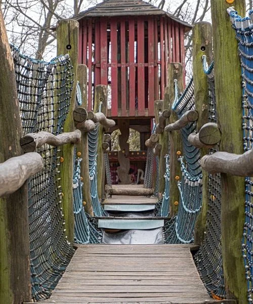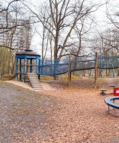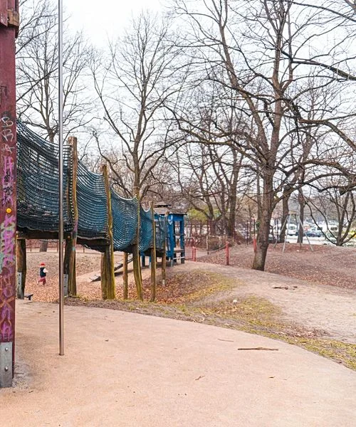 Der große Spielplatz im Schanzenpark ist einer dieser Orte, an denen sofort offensichtlich wird, warum so viele Familien immer wieder hierher kommen. Dieses typische Spielplatz-Murmeln hörst du schon aus der Ferne. Und wenn du näher kommst, wirst du erkennen, wie groß dieser Platz tatsächlich ist. Statt eines engen, überfüllten Stadtspielplatzes gibt es ein großzügiges Areal mit Klettertürmen, Seilen, Rutschen und einem großen Sandbereich, der sich wie ein riesiger Teppich ausbreitet. Was den Ort so behaglich macht. Er ist lebhaft, aber nicht stressig. Die Bäume in der Umgebung sorgen für Schatten, die Wege sind großzügig angelegt, und es gibt stets eine Bank oder einen Randplatz, von dem aus du alles gut beobachten kannst. Und dann gibt es da noch den Park an sich. Der Spielplatz befindet sich in einer grünen Umgebung und ist vom Schanzenpark umgeben, der als natürlicher Puffer dient. Wenn die Kinder eine Auszeit brauchen, kann man ein paar Schritte weitergehen, sich ins Gras setzen oder eine kleine Runde drehen. Obwohl man sich im Stadtzentrum befindet, fühlt es sich an wie ein kleiner Ausflug.